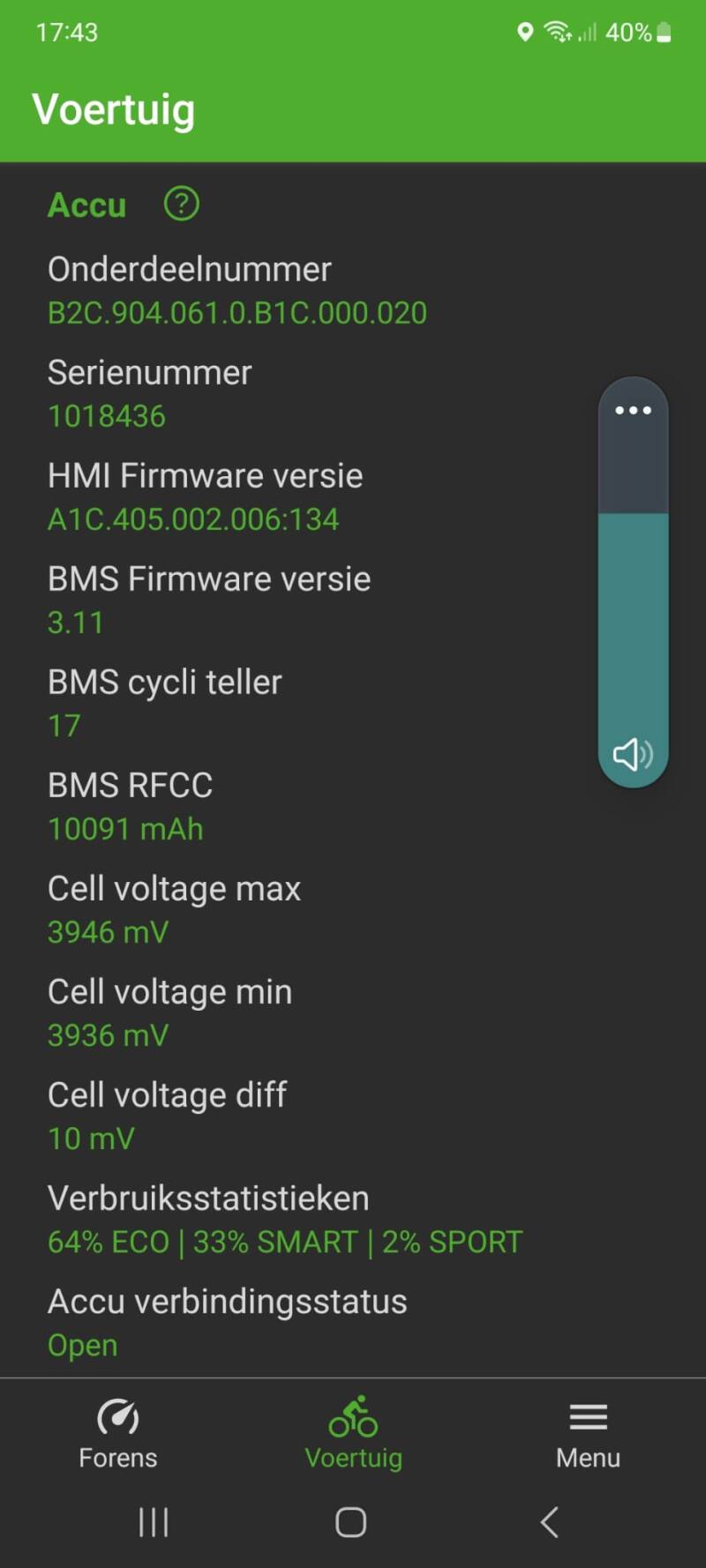 1000 kilometer delen door 17 keer laden (BMS cycli teller) gemiddeld 59 kilometer actieradius.